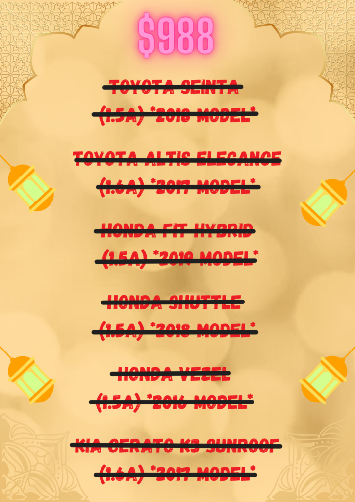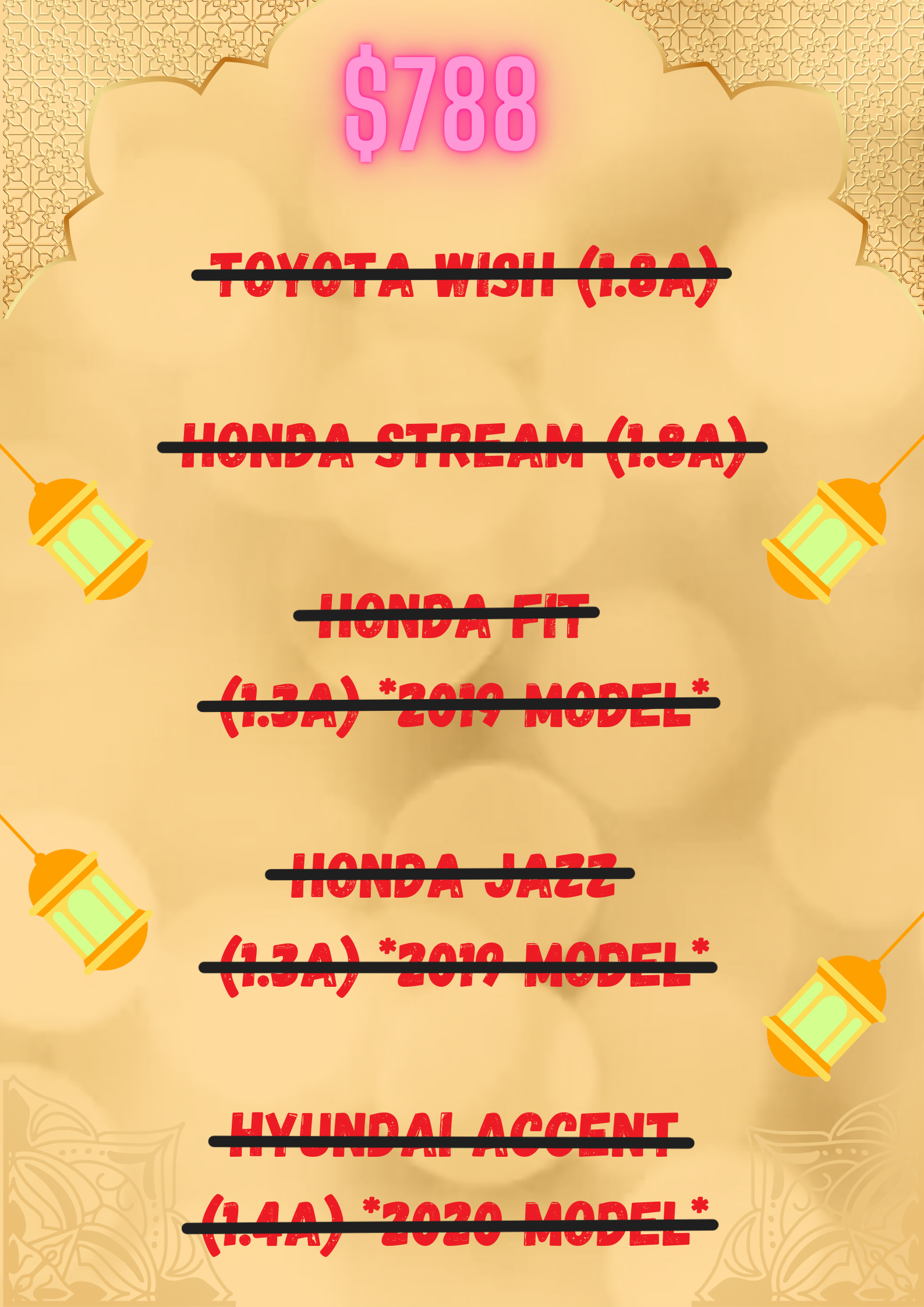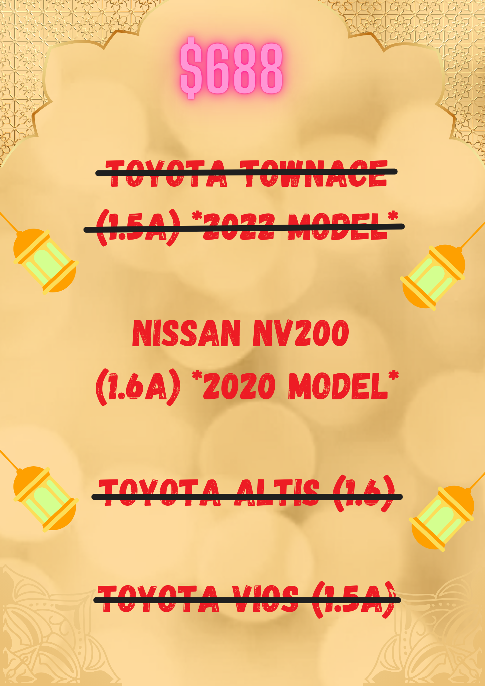 Festive Promo Embrace the holiday spirit with our exclusive festive promotions on your next car rental! Taking you anywhere you can imagine. Renting a car from us makes travelling around easier Rent Online Give us a call: +65 9845 1151